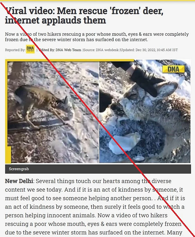 Conclusion: The video of two people trying to save a deer is from 2021 and Kazakhstan and is not related to the recent blizzard in the United States and Canada.
