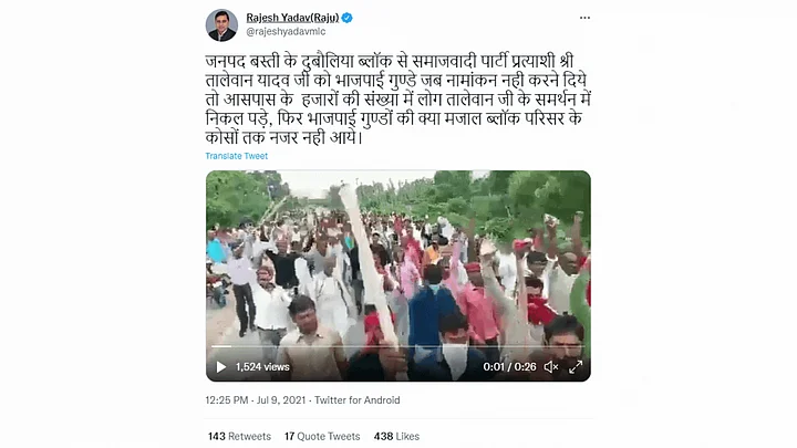 The caption of the tweet said that the crowd had assembled to protest in support of SP candidate Talewan Yadav. It further said that the supporters of the BJP were trying to prevent Talewan from filing nominations and that lead the SP supporters to show up.