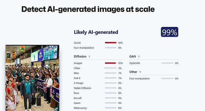 What did the detection tools show?: Team WebQoof passed the image through two AI detection tools namely — 'Hive Moderation' and 'SightEngine' to further verify its authenticity.