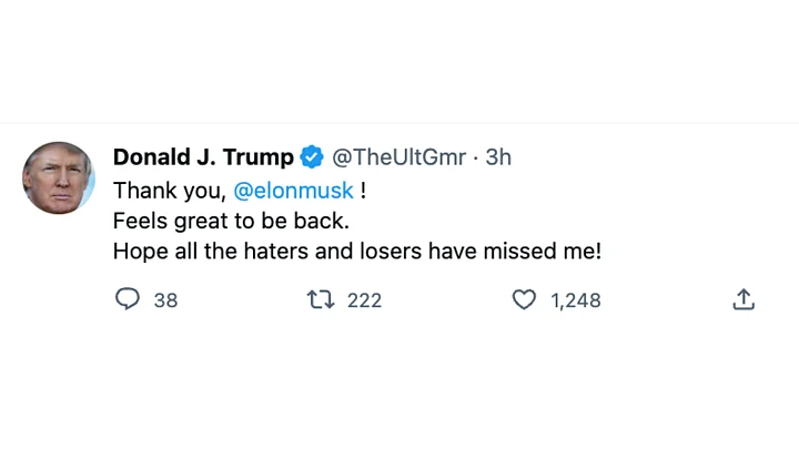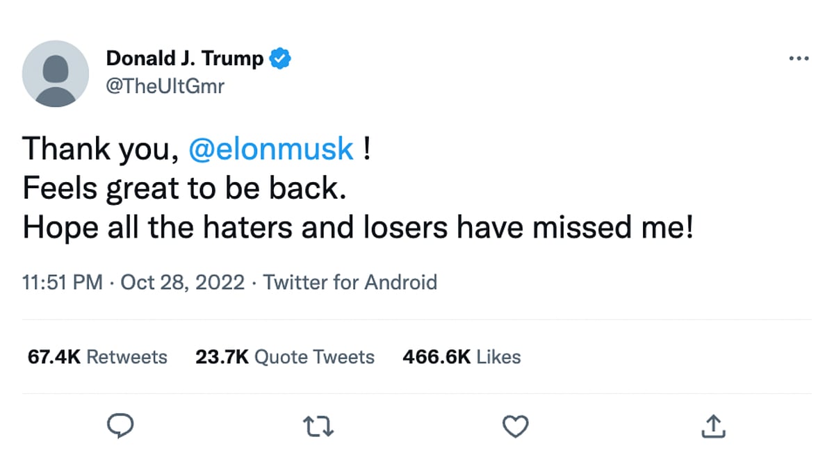 A screenshot of a tweet, purportedly shared by former United States (US) President Donald Trump, is being widely shared on social media, where Trump appears to thanking the Twitter's new CEO Elon Musk for reinstating his account.