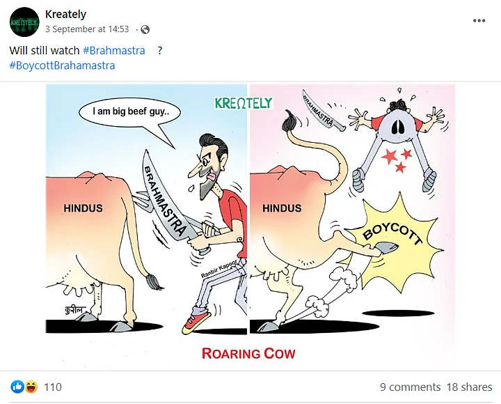 Another page supporting the Rashtriya Swayamsevak Sangh (RSS) (4,62,000 followers) also regularly posted similar messages. They also put out content specifically targeting 'Brahmastra' and questioning its success after the filmmakers and actors put out posts about the box-office collections.