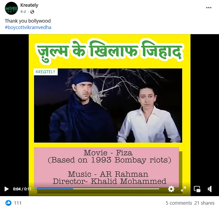 A page titled, “Hindutva Supporters,” which describes itself as ‘followers of Hindutva and BJP’, regularly posts visuals with captions calling for boycott of Bollywood. The page has close to 1,20,000 followers and features posts comparing the depiction of Hindus and Muslims in Bollywood.