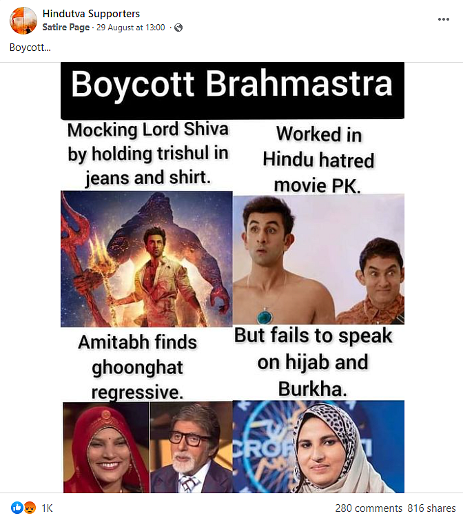 While we tracked the pages around the release of 'Brahmastra', the content from the page was more focussed on the boycotting the movie. Like the SSR groups and pages, several posts here also used old interviews and statements to create misleading narratives.