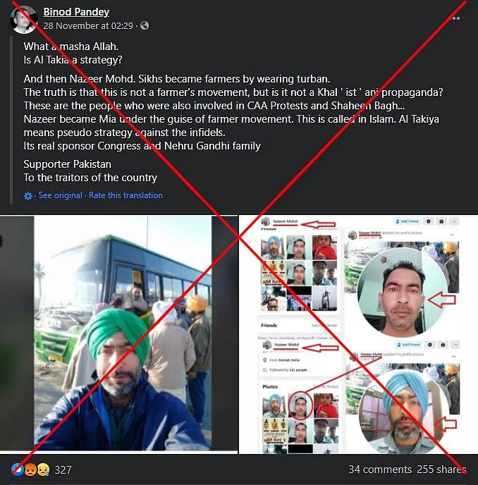 One of the posts viral with the claim had a caption that read, “...और फिर Nazeer Mohd. पगड़ी पहनकर Sikh किसान बन गए। सच्चाई ये है कि ये किसान आंदोलन नही बल्कि कहीं Khal'ist'ani प्रोपगंडा तो नहीं ? ये वही लोग हैं जो CAA प्रोटेस्ट्स और Shaheen Bagh में भी शामिल थे ...”