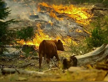 "A cow walks by flames from the Rim fire near the Yosemite National Park border in Groveland, California, on 24 August 2013," the caption stated.