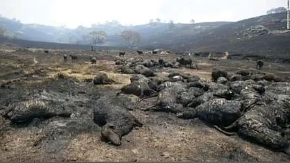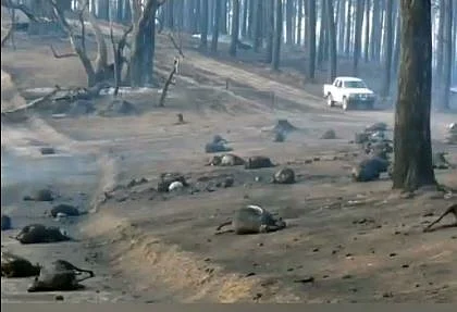 It combines multiple photos of animals killed in the fires, suggesting that they are of the currently raging wildfires. The collection of photos also includes the following four.