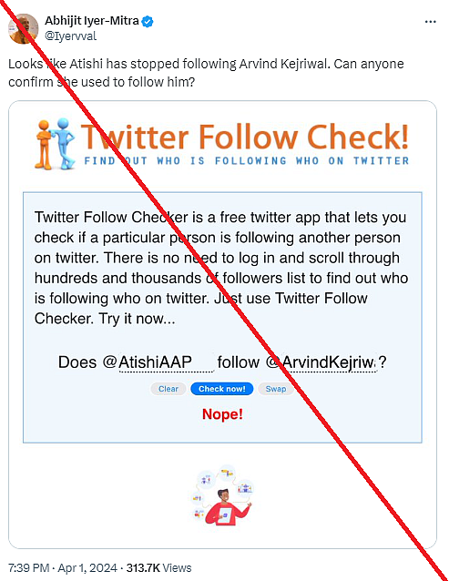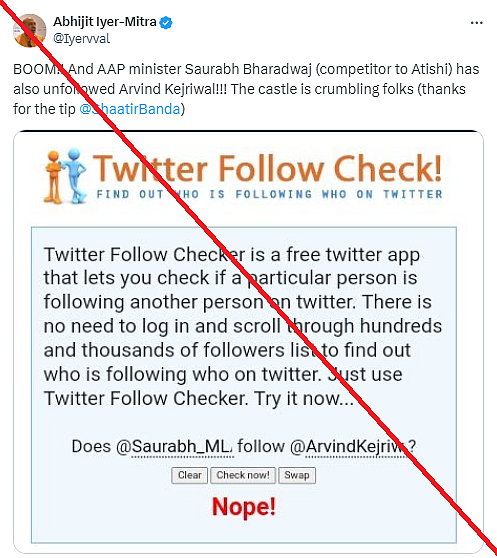 A claim is doing the rounds on social media stating that Delhi cabinet ministers Atishi and Saurabh Bharadwaj have unfollowed Delhi Chief Minister Arvind Kejriwal on X (formerly Twitter).