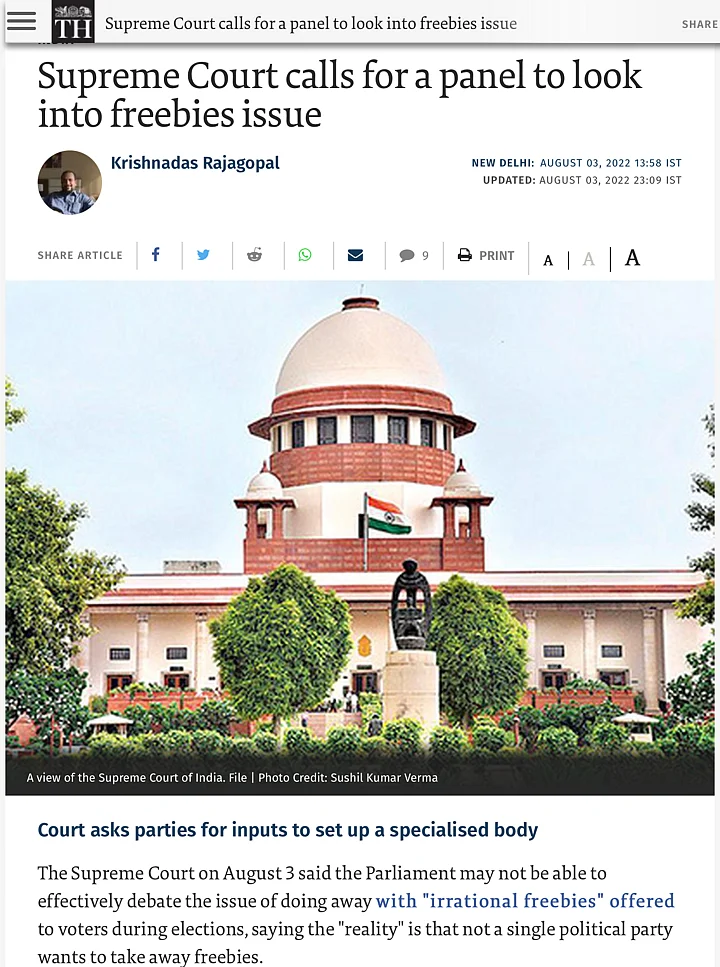 As per a report by The Hindu, the apex court called for a formation of a "specialised body" to oversee the freebies being offered by political parties and governments across the country.