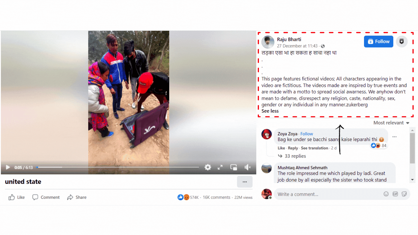 The caption of the video carried a disclaimer that said, "This page features fictional videos; All characters appearing in the video are fictitious. The videos made are inspired by true events and are made with a motto to spread social awarness. We anyhow don't mean to defame, disrespect any religion, caste, nationality, sex, gender or any individual in any manner.(sic)".
