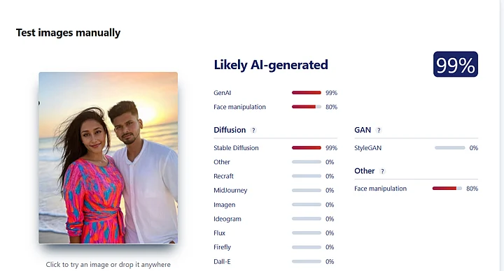 While the first tool gave 99 percent, the second one showed a little over 88 percent probability of the photograph being AI-generated.