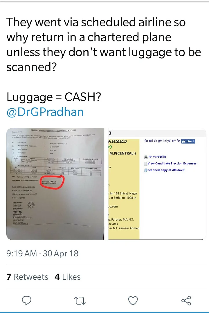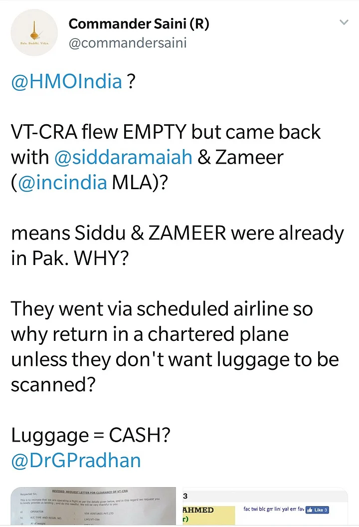 As per the fake letter, the flight from Karachi to Delhi took off at 7 pm sharp and reached Delhi 9:10 pm. This flight had two passengers – Siddaramaiah (without any initials) and Zameer Ahmed. These two passengers then left Delhi at 11:45 pm and reached Bengaluru 2 am.