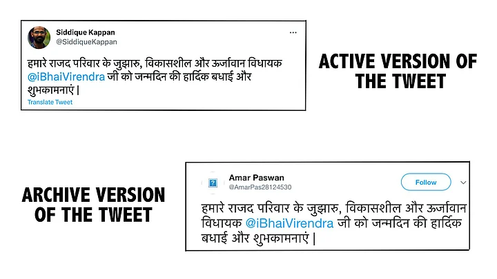 We then looked at older tweets and found one in which the user had wished RJD leader Bhai Virendra on his birthday. A look at the archive of this tweet on Wayback Machine – an archiving tool – showed the same tweet but with @AmarPas28124530 as the user name. [Archive here]