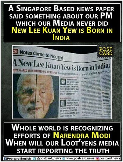 On the same day (10 November 2016) Singapore-based website The Independent’s headline ‘Modi does a Lee Kuan Yew to stamp out corruption in India’ was reported by a few Indian media outlets such as Zee News.