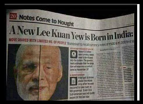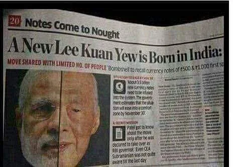 “Taking a political call of an economic move of this magnitude, government insiders feel, has brought “new respect“ for the PM. A highly-placed government functionary even sought to equate him with Singapore’s legend Lee Kuan Yew. “From making up his mind to rolling it out yesterday (Tuesday), a new Lee Kuan Yew is born in India. It will be reflected in the legacy of this Prime Minister,“ he said.”