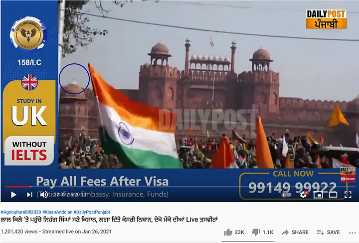 At 22:32 minutes, the reporter can be heard saying that the protesters have reached the Red Fort. At the same timestamp, one can see that there is no Tricolour on the minaret.