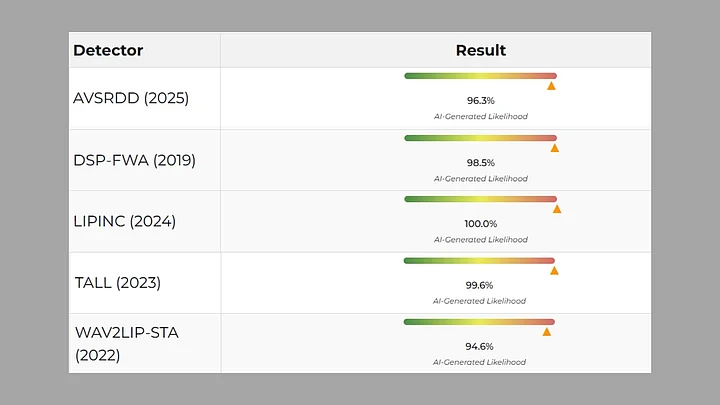 Five detectors of the second tool showed conclusive results indicating that the video was indeed AI-manipulated.