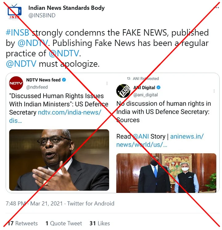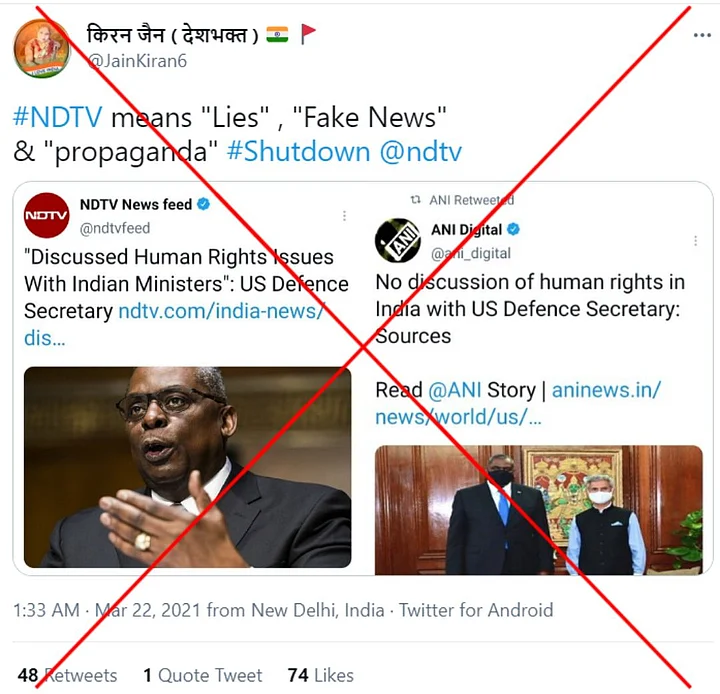 Several social media users falsely claimed that NDTV peddled ‘fake news’ after the media house published a report on the visit of US Defence Secretary Lloyd Austin to India.