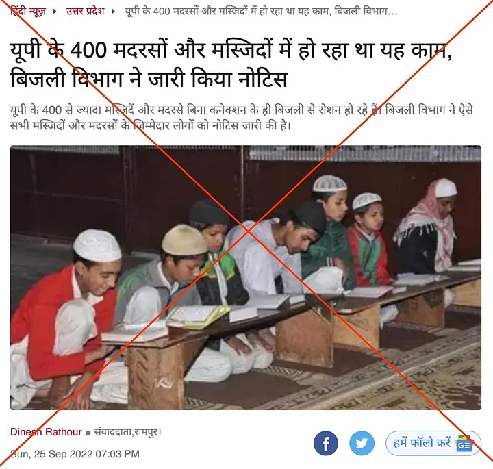 Hindi news organisations – Navbharat Times and Live Hindustan – ran a news article about power theft in Uttar Pradesh's Rampur stating that about 400 mosques and madrasas were using electricity without a registered connection.