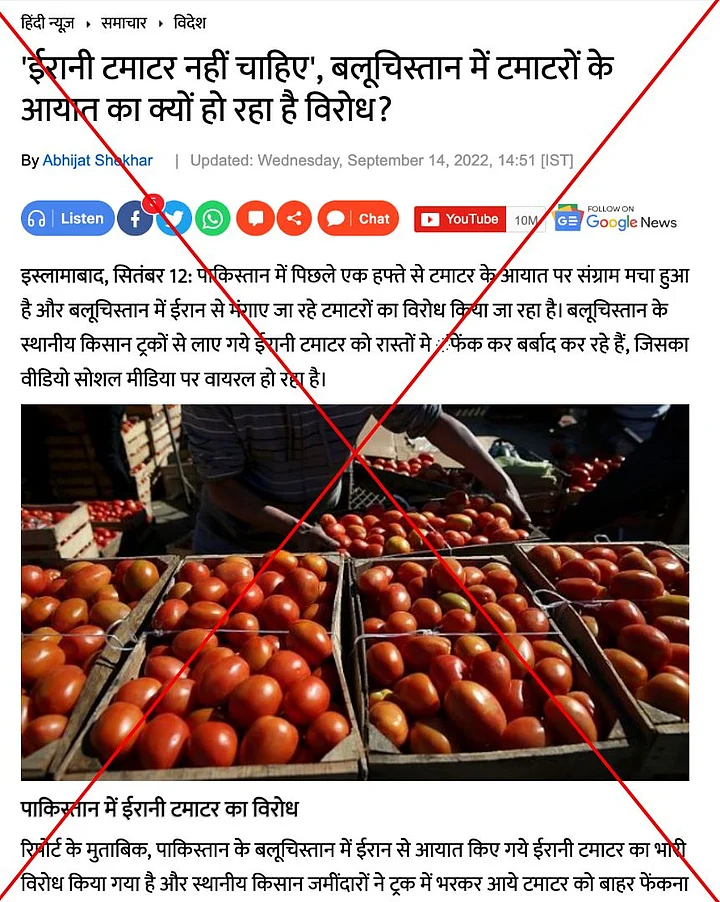 We also found a report by Pakistani news portal GeoNews, which also mentioned that the farmers destroyed the imported tomatoes, as they feared losses for their own crops, which would have to be sold at lower prices.