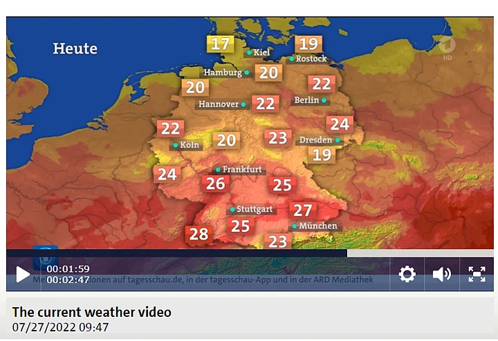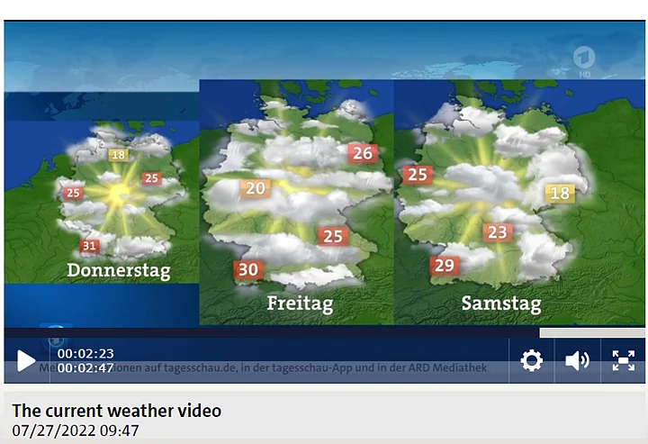 We also checked the most recent weather report available on Tagesschau and noticed that the channel still uses a green colour map to show predictions for the next three days and a different map to show the weather report for the day.