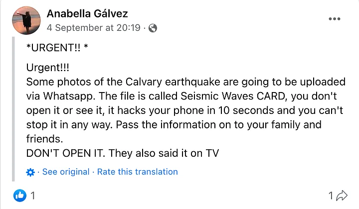 Newtral also noted that similar messages had been previously linked to the Colombian earthquake. However, the pictures were attributed to a Chilean volcano eruption. Even then, INCIBE had verified that those messages were a hoax.