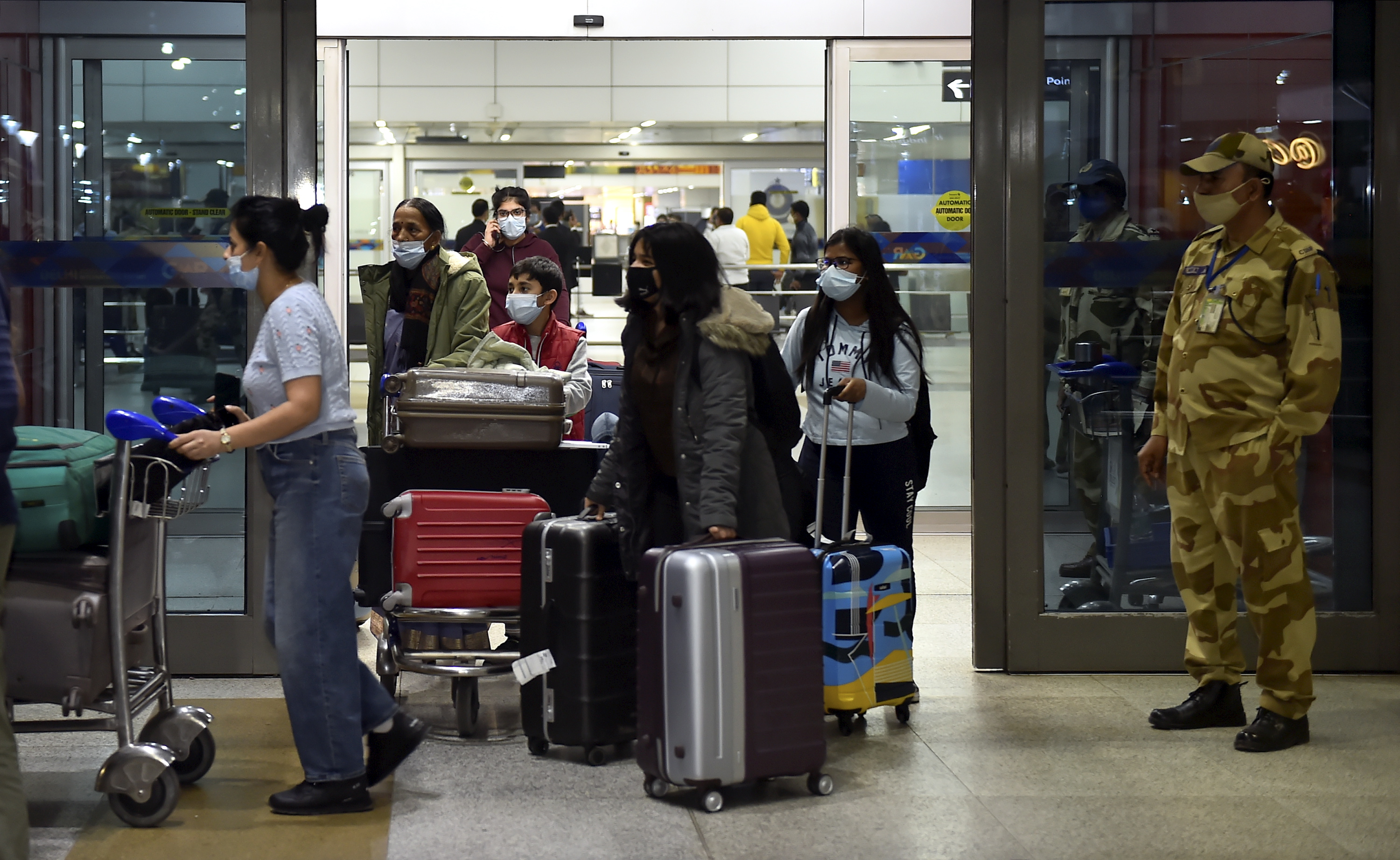 Indian nationals come out from the IGI Airport on their arrival by an Air India flight from Ukraine amid rising Russia-Ukraine tensions.