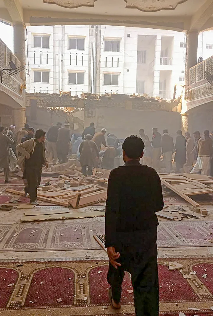 Locals at the site after a suicide blast ripped through a mosque during afternoon prayers, in Peshawar, Pakistan, Monday, 30 January.