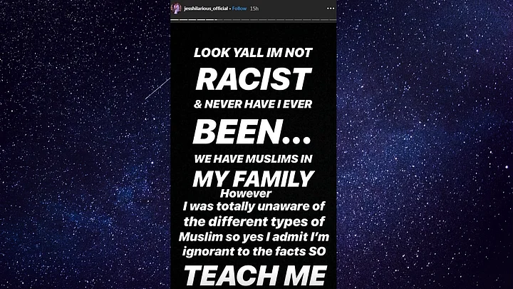 "Look Yall Im not racist and never have I ever been...We have Muslims in my family. However, I was totally unaware of the different types of Muslims, so yes I admit I'm ignorant to the facts so teach me," she wrote on Instagram.