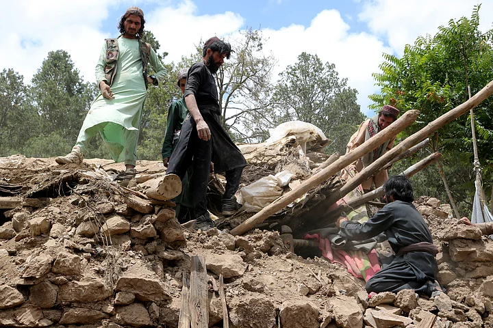 Afghan villagers collect belongings from under the rubble of a home that was destroyed in an earthquake in the Spera district of the southwestern part of Khost Province, Afghanistan, Wednesday, 22 June.