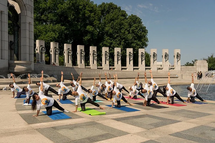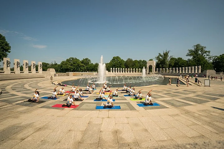 People practicing Yoga at the World War 2 Memorial in Washington DC.