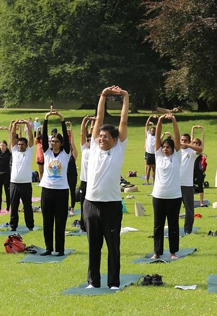 Union Minister Piyush Goyal practicing Yoga with others in Brussels, Belgium.