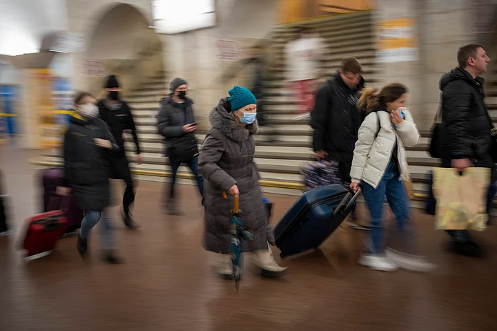 People walk in a subway to get a train as they leave the city of Kyiv, Ukraine.