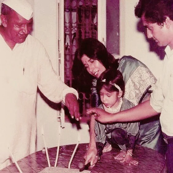 Author and her parents. Her mother is seen wearing the same silk saree.