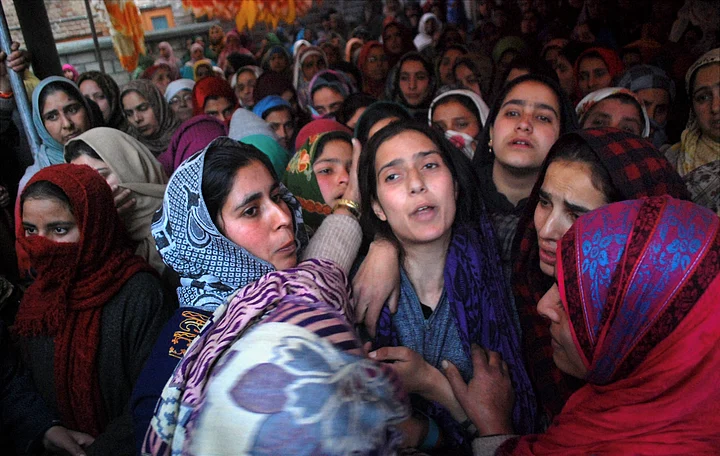 - 04/04Family members of CRPF constable Sharif ud Din Ganai crying during his funeral procession on 31 December.(Photo: PTI)