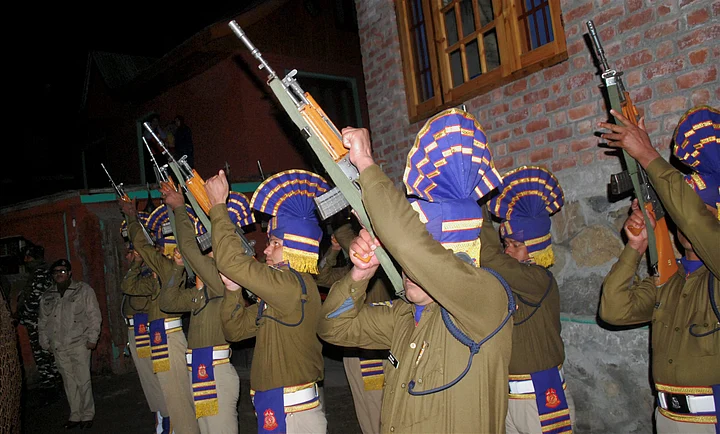 - 01/04CRPF personnel fire in air to give gun salute to constable Sharif ud Din Ganai during his funeral in Srinagar on Sunday, 31 December.(Photo: PTI)