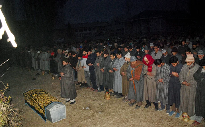 - 03/04People offering funeral prayers of CRPF constable Sharif ud Din Ganai on 31 December.(Photo: PTI)