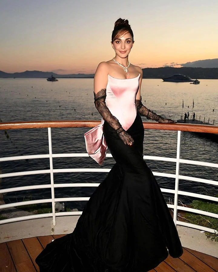 Kiara Advani made a stunning debut at the 2024 Cannes Film Festival. She wore a mermaid-fit, corseted gown with intricate details and a dramatic bow at the back, showcasing her love for clean silhouettes. She paired the gown with semi-sheer gloves and styled her hair in a sleek bun. Her makeup featured bold eyes, nude lips, and her signature dewy look, completing her glamorous appearance.
