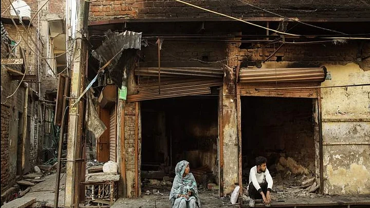 A mother and her son sitting outside their vandalised house in Shiv Vihar, Delhi
