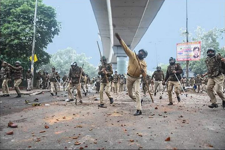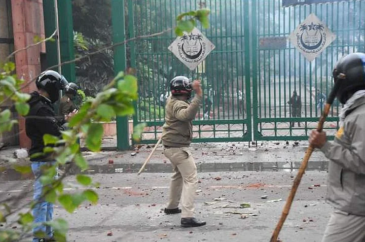 13 December 2019: A policeman pelting stones at the students of Jamia Millia Islamia