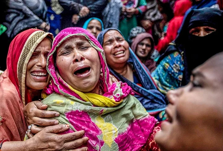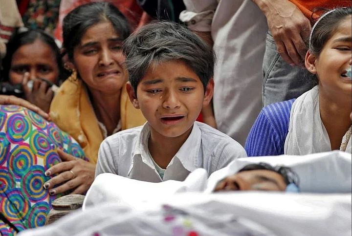 The mother of 17-year-old Mohammad Hashim and 23-year-old Mohammad Amir cries helplessly after her sons are killed by a Hindu mob