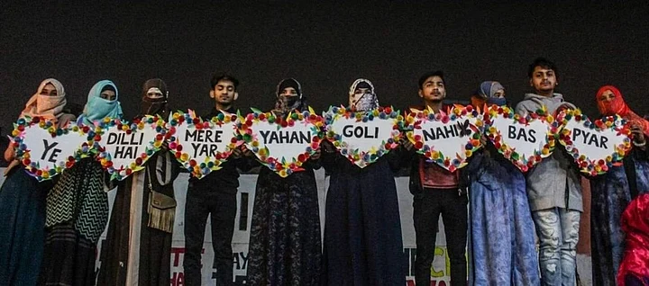 Protesters appealing for love instead of bullets at the Jafrabad protest site in Delhi