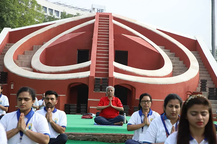 Finance Minister Nirmala Sitharaman meditates at a Yoga event at Delhi's Jantar Mantar.