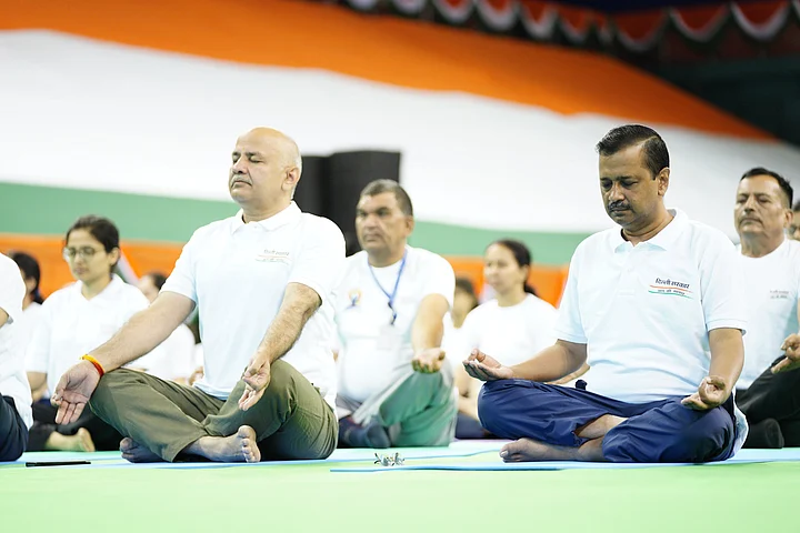 Delhi Chief Minister Arvind Kejriwal with deputy CM Manish Sisodia meditating on Yoga Day.