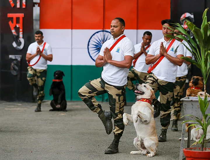 Border Security Force (BSF) personnel with their sniffer dogs during a yoga session, on the occasion of the 8th International Day of Yoga, at Suchetgarh border post, in Jammu on Tuesday.