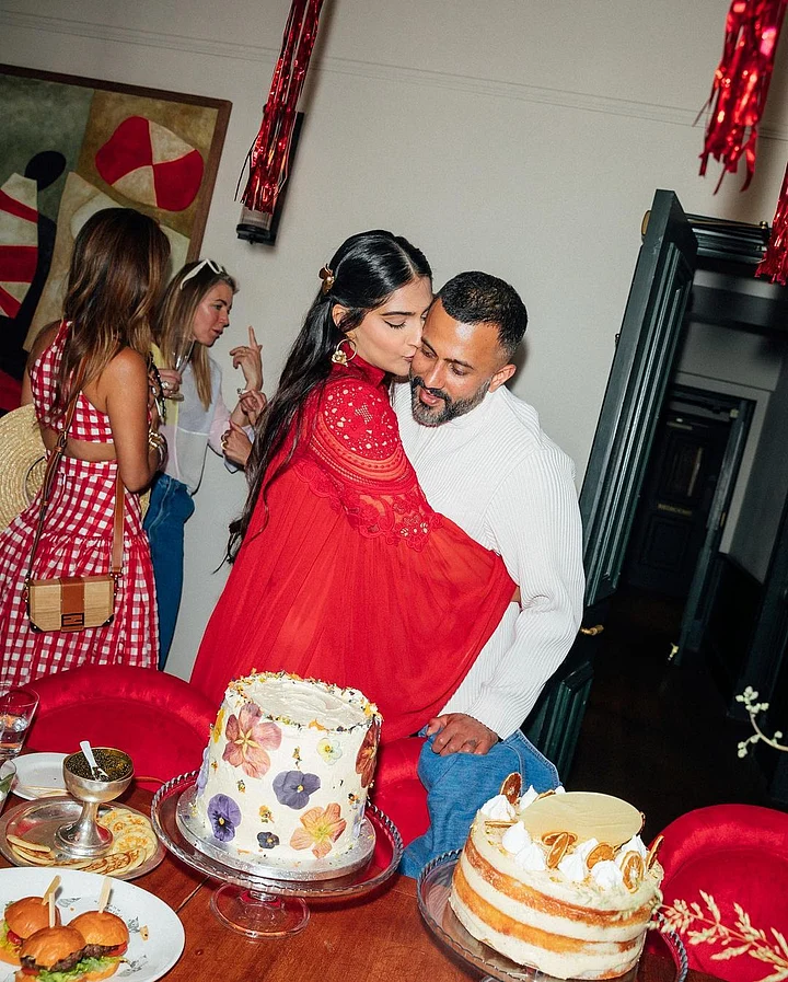 Actor Sonam Kapoor celebrated her birthday on Friday. She shared glimpses from her birthday party at her London home. She wrote, "My two beautiful boys, friends, cake, champagne, oysters, caviar and the perfect summer day! What more can a girl in red dress ask for her birthday. Thank you to everyone who wished me and to the universe for giving so bountifully."