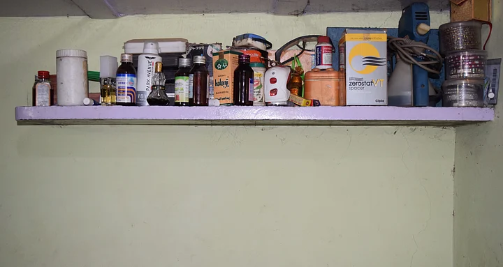 - 01/03A shelf with all of Jabbar’s medications, breathing and steaming devices and syrups. (Photo: The Quint/Pallavi Prasad)