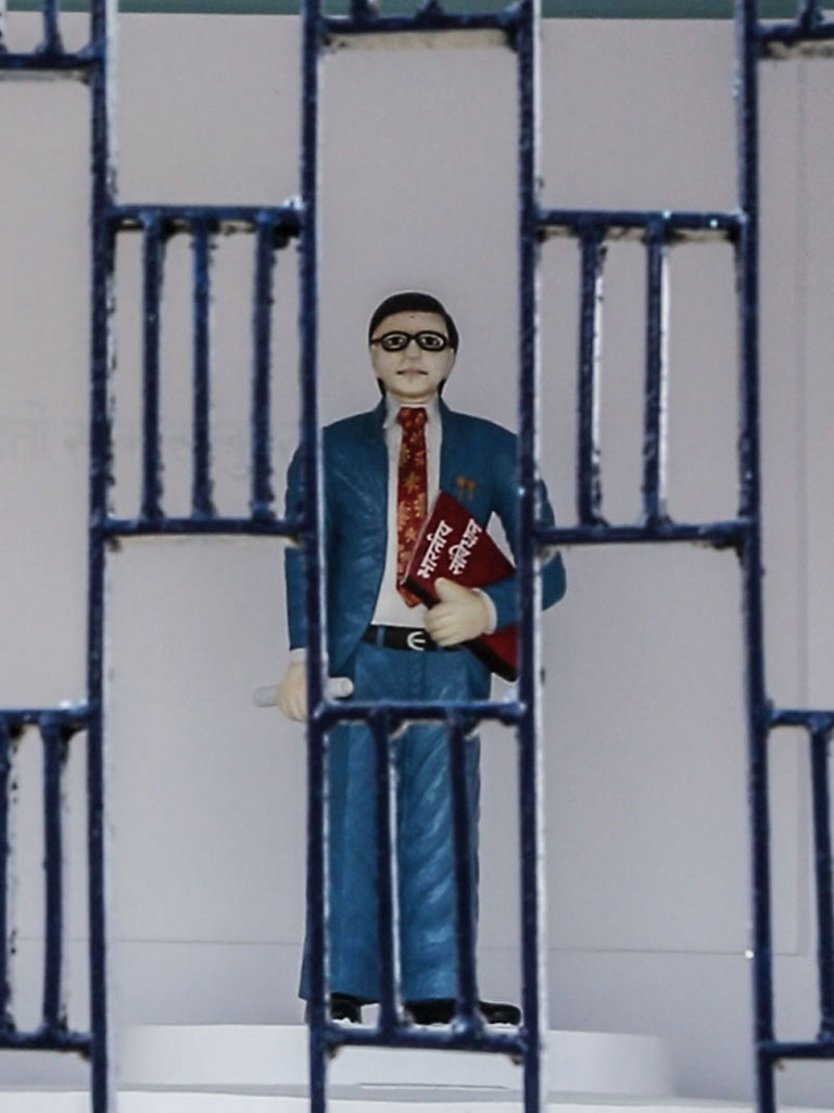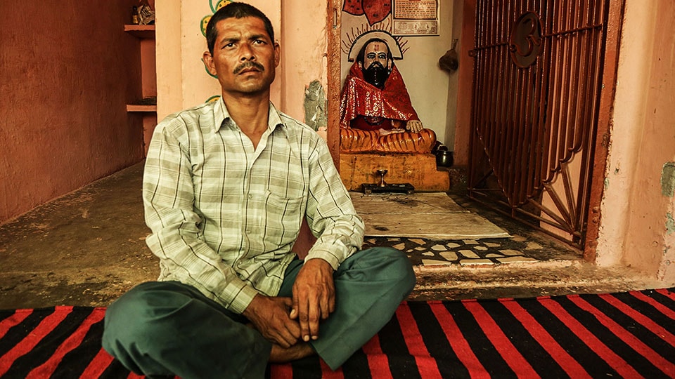 गठेड़ा गांव का पुजारी रविदास की मूर्ति के पास बैठता है, जाे 15वीं शताब्दी के महान संत थे, जिनके लिए दलितों के मन में श्रृद्धा है. नवंबर 2016 में, उनकी मूर्ति को तोड़ा गया. आरोप तीन मुस्लिम युवकों पर है, यह इलाके में साम्प्रदायिक हिंसा को हवा देने की कोशिश थी (फोटो: ऐशा पॉल/द क्विंट)