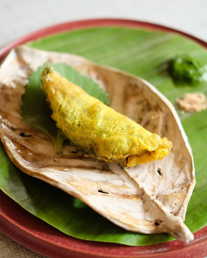 For all the pakora lovers: Cumin leaf stuffed with sweet shrimps seasoned with amchur salkt, ajwain and spicy grilled green chili chutney.