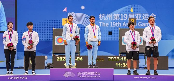 India claimed its first gold medal in archery competitions at the 19th Asian Games on Wednesday with Jyothi Surekha Vennam and Ojas Deotale combining to beat South Korea in the compound mixed team gold medal match at the Fuyang Yinhu Sports Centre.