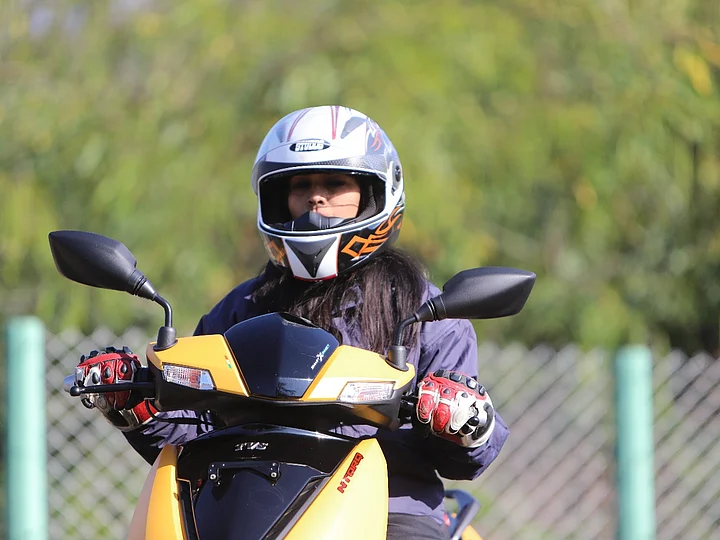 Riding the brand new Ntorq at the TVS racing track in Hosur was indeed a gratifying experience. The sleek and flamboyant look of the 125cc vehicle made me want to swing my leg over it, turn the accelerator and feel the wind in my hair – which is exactly what I did.